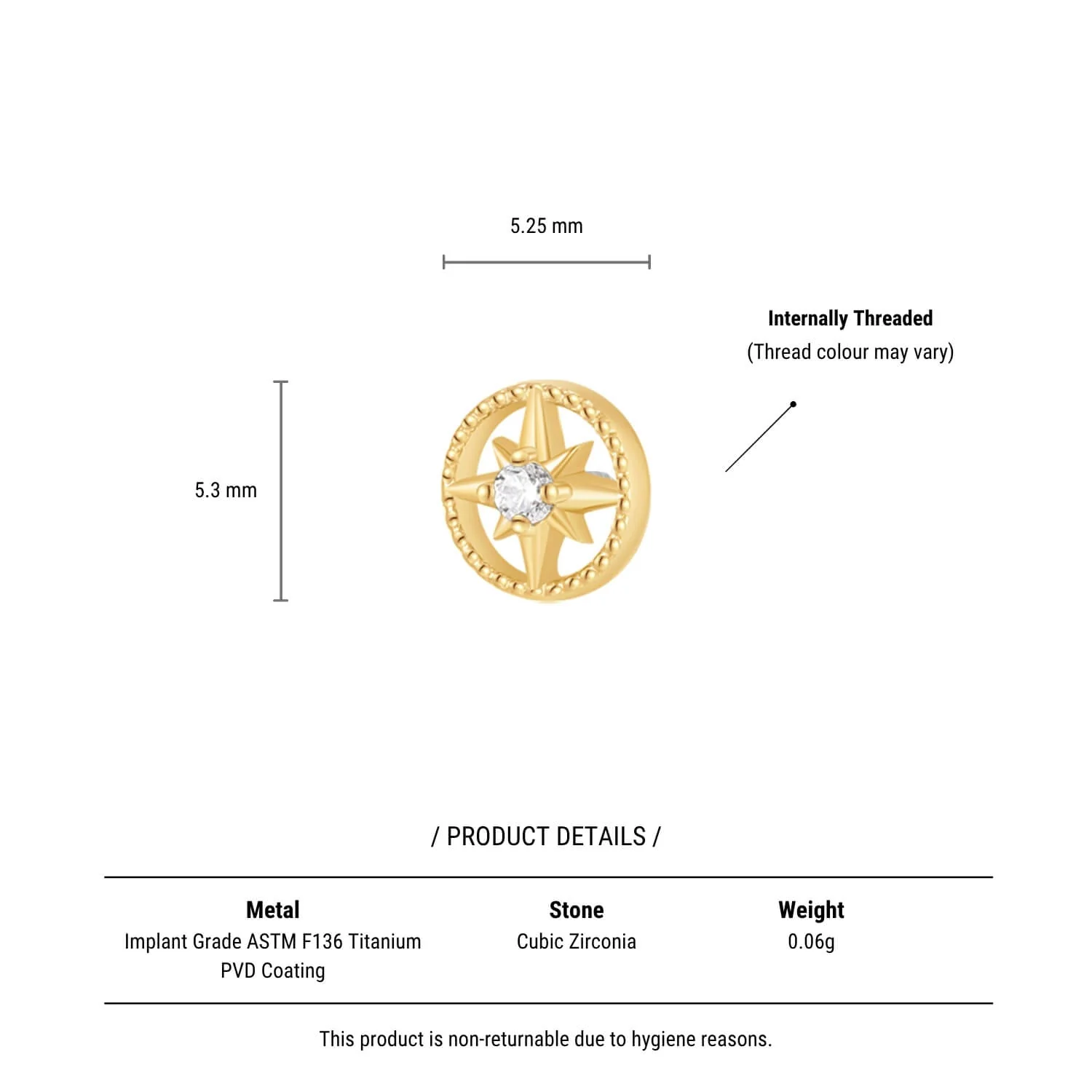 For the ones who trust their own direction. The Celestial Compass Piercing features a delicate starburst design with a single white CZ at its centre, framed by a softly detailed circle. It brings a subtle celestial feel to your ear without overpowering your lookāeasy to style, quietly eye-catching, and made for everyday wear.