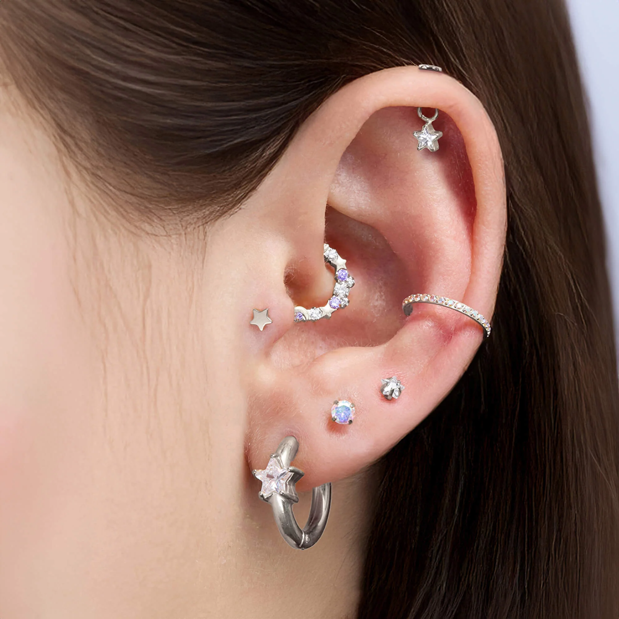 A little sparkle that moves with you. The Floating Bezel Star Charm Piercing features a crisp star-shaped crystal framed in a smooth bezel, suspended for soft, eye-catching movement. Crafted from implant-grade titanium for comfortable, everyday wear, it adds a playful yet polished finish to your piercing line-up.