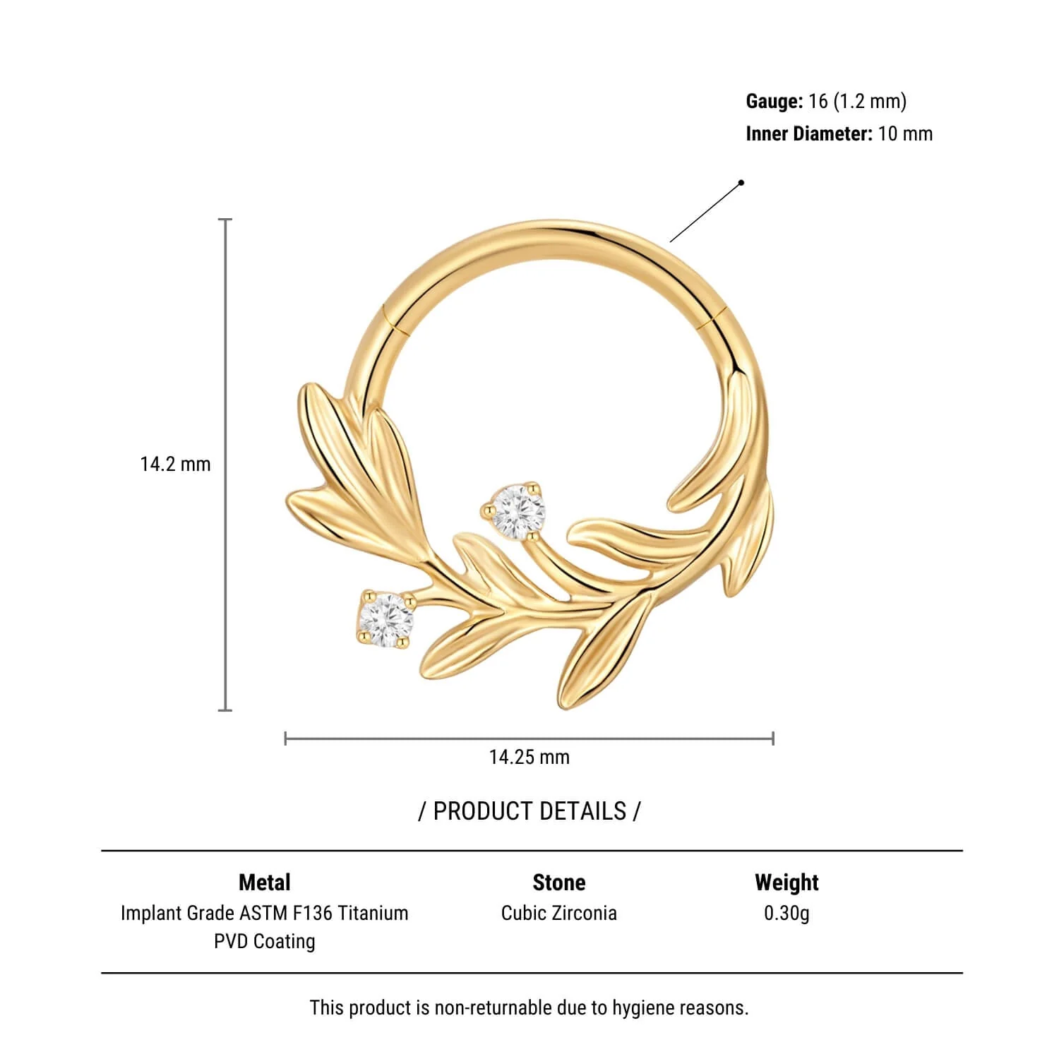 A little sparkle, wrapped in natureās charm. The Sparkle Wreath Clicker features delicate leaf-like curves forming a soft wreath shape, accented with two round clear cubic zirconia stones for a subtle touch of shimmer. Elegant yet playful, this clicker adds graceful detail to your ear stack while remaining comfortable for everyday wear.