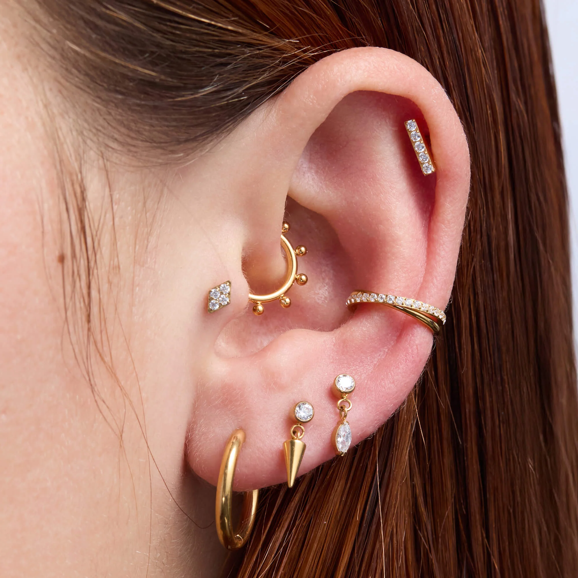 A subtle edge with effortless movement. The Spike Dangle Piercing features a classic round CZ stud paired with a sleek tapered drop that sways gently with every turn. Striking yet refined, it brings a modern attitude to your piercing lineup while staying lightweight and comfortable for everyday wear.