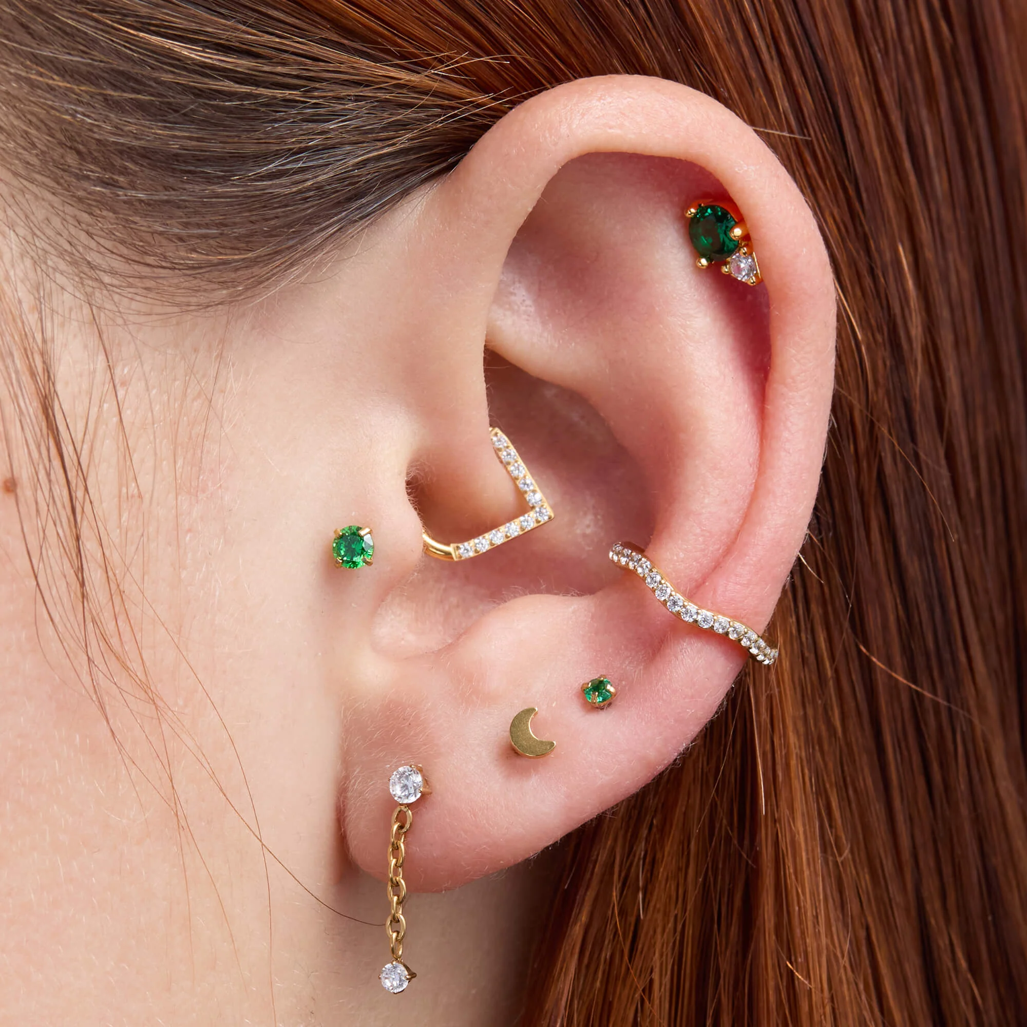 Effortless movement, endless sparkle. The White CZ Chain Dangle Piercing features two round CZ stones connected by a delicate chain that sways subtly with every turn. Lightweight yet eye-catching, it brings soft elegance and fluid detail to your ear styling while staying comfortable enough for all-day wear.