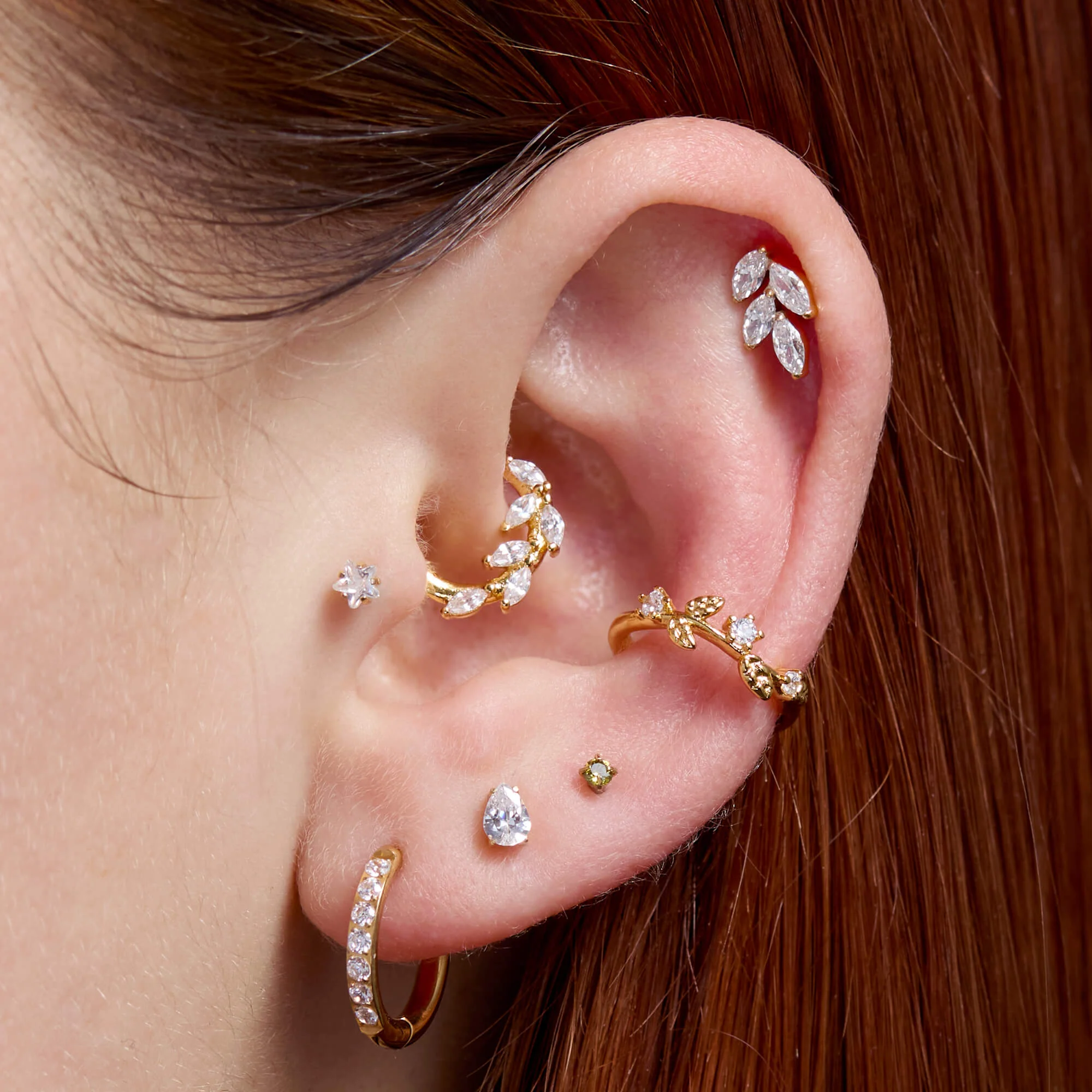 Nature-inspired sparkle with a clean, modern edge. Four marquise-cut stones are arranged in a crisp leaf formation, creating a balanced, light-catching design that feels elegant without being overpowering. Polished, comfortable, and easy to style, it adds refined detail to any piercing lineup.